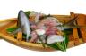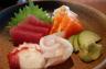 explanation: Initially fresh fishes were eaten with vinegar (Namasu). Gradually it has been replaced by soy sauce. Usually fishes cut off to small pieces are consumed by dipping into soy sauce with shredded radish or wasabi (horseradish). When they are arranged to preserve the initial form, it is called "ikizukuri". Most appreciated are tune fish and bonito among red meat fishes, and flounder and horse mackerel among whites. Some mollusk such as shrimp and a bit boiled octopus are also appreciated.