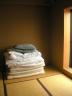 explanation: Mats to cover the floor of Japanese traditional houses. A block of nested straws is covered by igusa plant (a kind of reed) When Tatami is worn, you exchange only igusa cover. Initially laid only at the sleeping place like a bed, its usage had been extended everywhere since Muromachi period in upper class houses, and also to middle class ones since Edo period. A tatami has about 90cm width and 180cm height and this surface (Jo) is used as the unit of a room size in Japan.